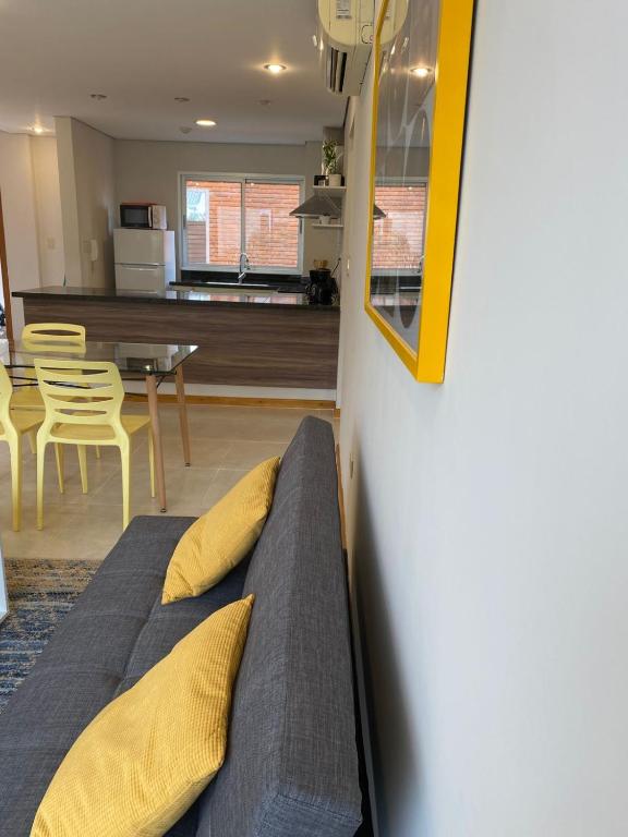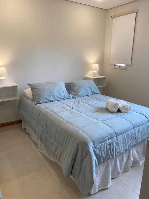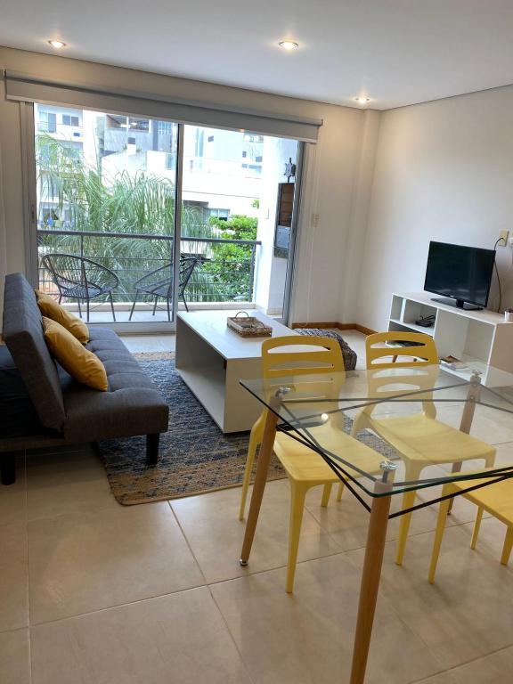 2 habitaciones | 2 camas matrimoniales | 1 sofá cama individual | 2 baños completos | Balcón con parrilla | Piscina | Estacionamiento | Comedor | Living | TV | Wifi | Cocina equipada: cocina, horno, microondas, hervidora, mixtera, extractor, utensilios, ollas, sartenes.