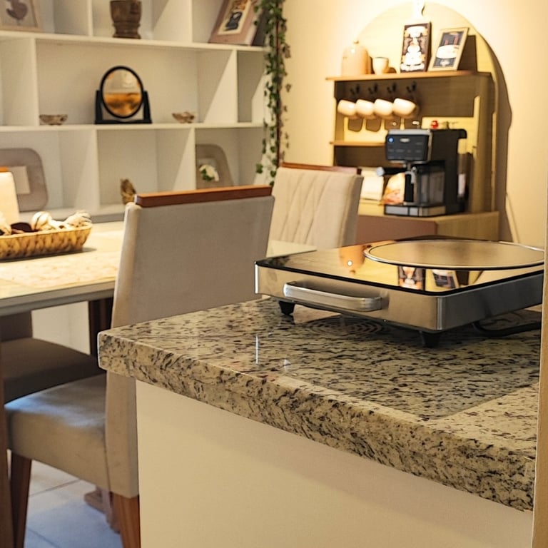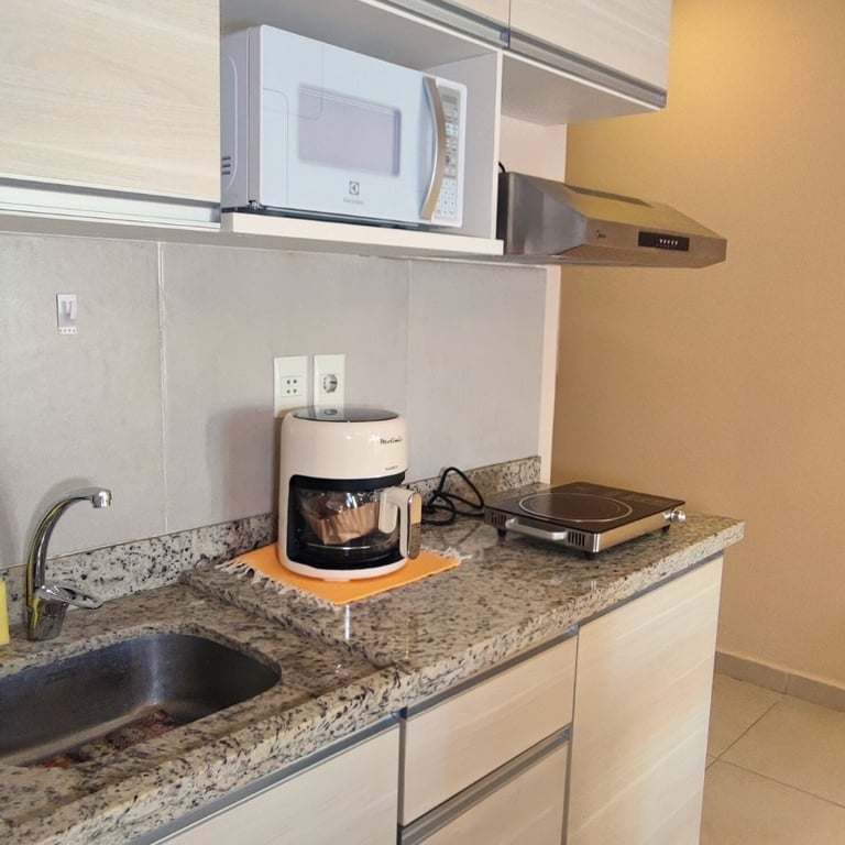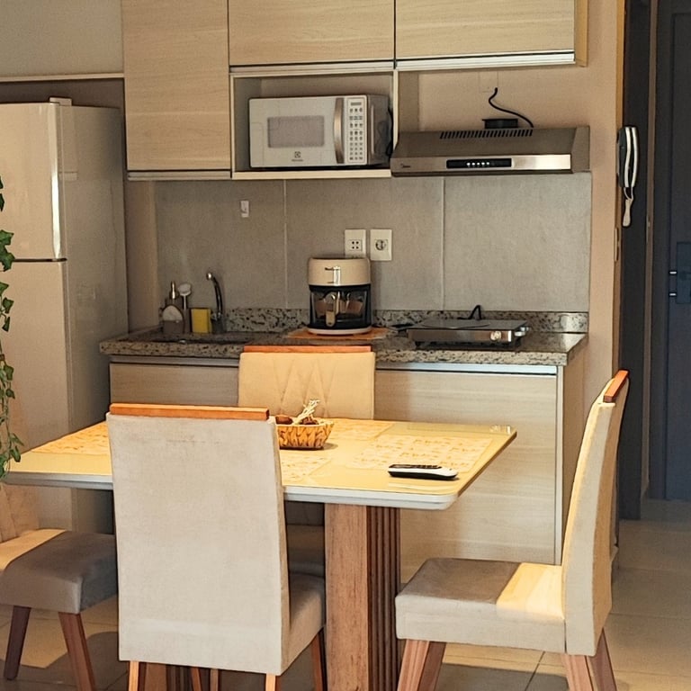 1 cama queen | 1 baño completo | Balcón | Estacionamiento | Comedor | Living | TV | Wifi | Cocina equipada: cocina, airfryer, microondas, máquina para hacer café, extractor, utensilios, ollas, sartenes.